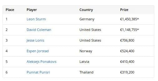这场为期三天的赛事总奖池达到4,559,940欧元,最后六名选手获得奖励。Coleman获得亚军奖金1,148,755欧元,Jesse Lonis以季军成绩706,800欧元延续其2025年的强劲表现。"我觉得自己此刻非常幸运,"Sturm补充道。