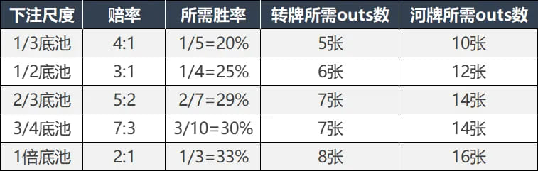 转牌圈因为只剩1张牌了,所需outs要双倍。