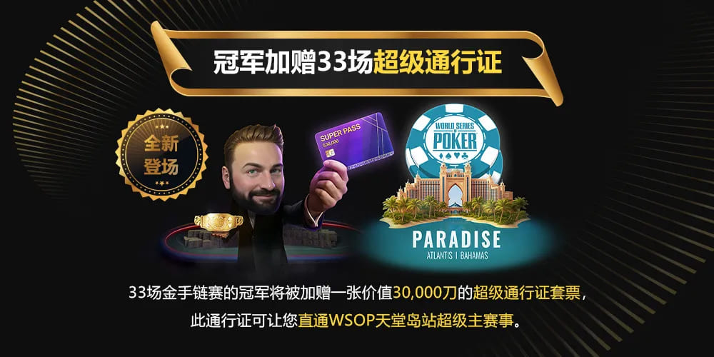 33场金手链赛的每一位冠军,都将额外获得一张价值3万刀的“超级通行证(Super Pass)套票”,可直通年底WSOP天堂岛站超级主赛事!