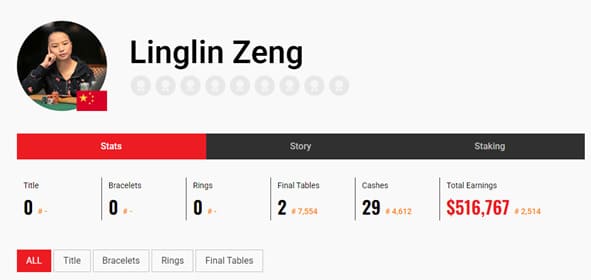 曾玲琳,江西籍职业牌手,2006年赴美攻读硕士期间,在凤凰城娱乐场接触德州扑克,从低级别游戏(2/3美元)起步,逐步提升至10/20级别,并通过业余打牌挣取美国硕士学费。