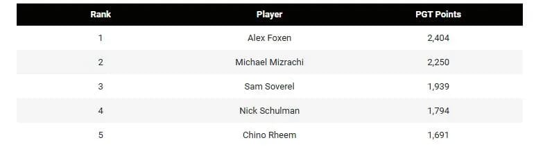 此次胜利为Foxen带来27.2万美元奖金和272点PGT积分,足以助他超越原居榜首的Mizrachi。Mizrachi此前凭借赢得扑克玩家锦标赛和WSOP主赛事冠军登上榜首,而Foxen本赛季已取得三场胜利并有18次进入奖励圈。