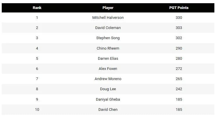 Darren Elias和Chino Rheem 也在本周末的扑克大师赛中获胜,双双跻身“紫夹克”争夺榜前五。Halverson在前六场比赛中三次进入奖励圈仍保持领先,但David Coleman和Stephen Song紧随其后——Coleman赢得开幕赛并另有一次奖励圈记录,而Song则已四次进入奖励圈并三度跻身决赛桌。