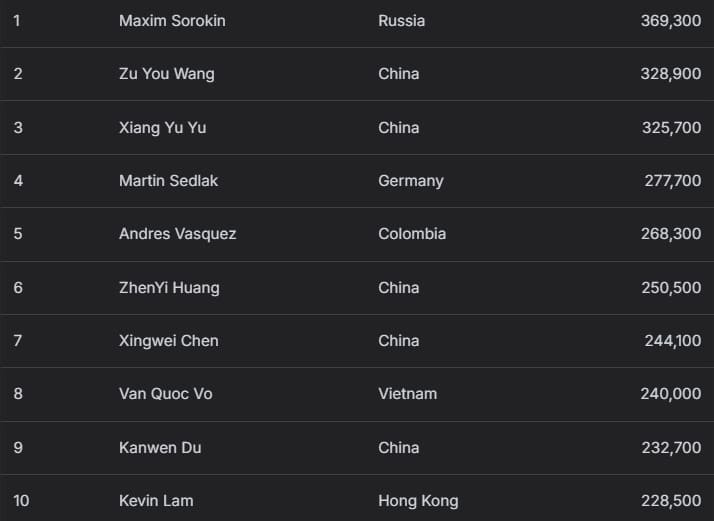 经过十个60分钟级别的角逐,最终仅144名选手成功封袋。俄罗斯选手Maxim Sorokin以369,300记分牌量登顶赛事领先榜,也是其中三位记分牌量突破30万的选手之一,另两位是中国选手Zu You Wang(328,900记分牌)和Xiang Yu Yu(325,700记分牌)。