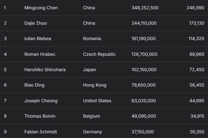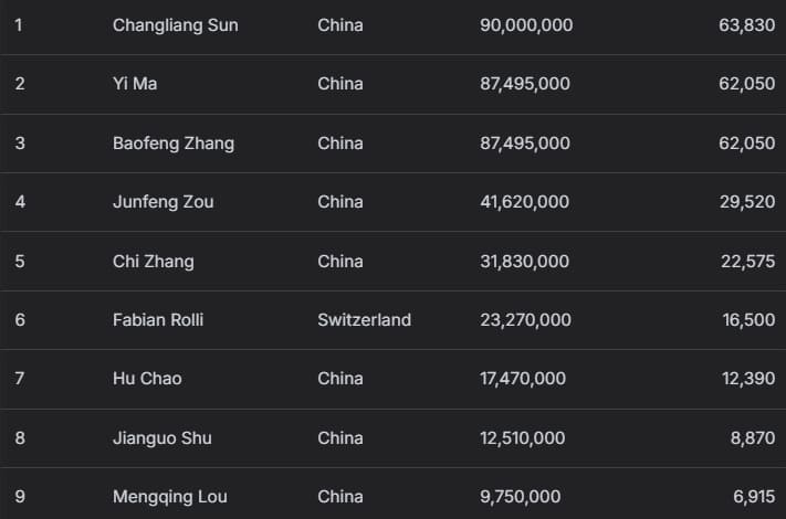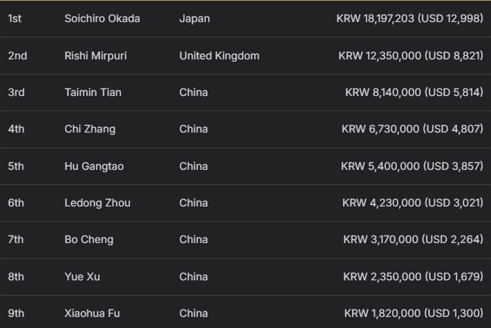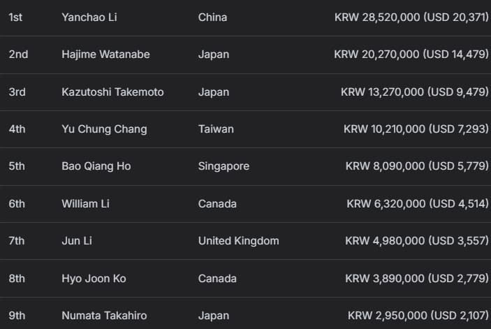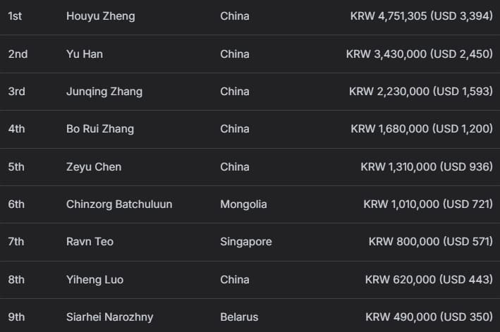 Yi Ma、Baofeng Zhang分别获得87,495,000韩币(约合62,050美元)奖励,其中Yi Ma额外收获9,250,000韩币(约合6,560美元)赏金;Baofeng Zhang则创下个人最高奖金纪录,并赢得11,000,000韩币(约合7,800美元)赏金。