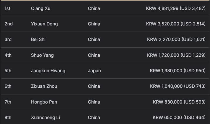 亚军由同胞Yixuan Dong获得,收获3,520,000韩币(约合2,514美元)奖励;同样来自中国的Bei Shi位列季军,获得2,270,000韩币(约合1,621美元)。