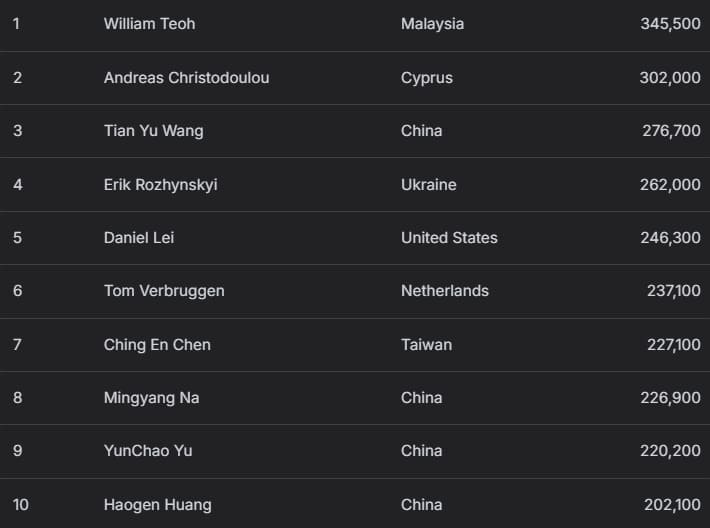 同胞Liao Cheng获得亚军,收获8,710,000韩币(约合6,221美元)奖励;Yanchao Li(近日刚在系列赛收获个人第二座APT冠军)位列季军,再次稳定输出,获得5,660,000韩币(约合4,043美元)奖金。