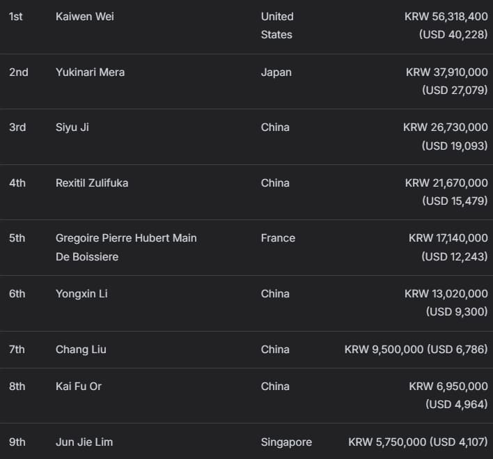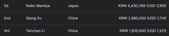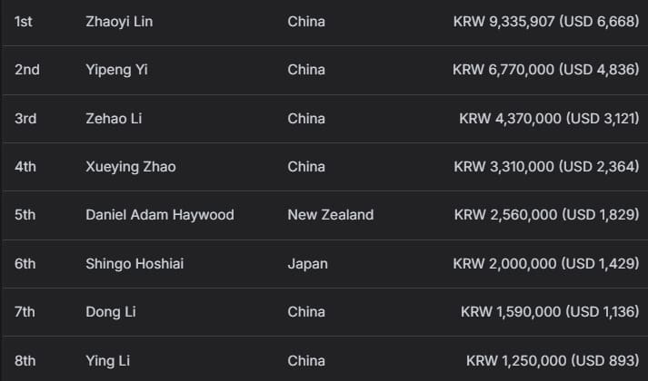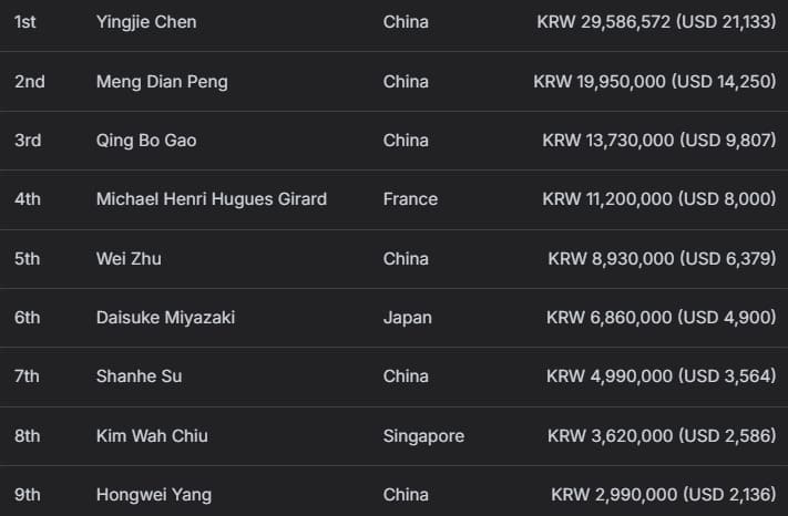 根据协议,中国选手Zhihao Zhang获得亚军及13,830,000韩币(约合9,879美元)奖励;日本选手Akihide Shimizu位列季军,获得12,270,000韩币(约合8,764美元)。