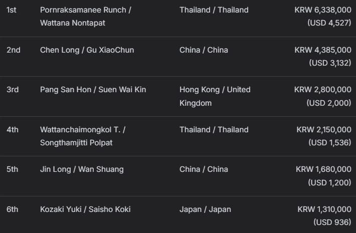中国组合Chen Long与Gu XiaoChun获得亚军,分别赢得4,385,000韩币(约合3,132美元)奖励;香港选手Pang San Hon与英国选手Suen Wai Kin的组合位列季军,分别获得2,800,000韩币(约合2,000美元)。