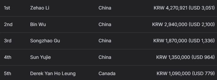 亚军由同胞Bin Wu获得,收获2,940,000韩币(约合2,100美元)奖励;另一位中国选手Songzhao Gu位列季军,获得1,870,000韩币(约合1,336美元)。