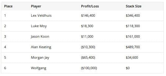 本集结束时,Veldhuis在57手牌中盈利146,400美元,暂居本场游戏盈利榜榜首。上周表现势如破竹的Keating目前亏损10,300美元。遭Keating诈唬的Moy仅盈利 18,300美元——他必须在150手牌内实现盈利才能带走奖金。Wolfgang在本集后期遭淘汰出局。扑克之星大使Jason Koon盈利11,000美元,是桌上另一位保持盈利的选手。