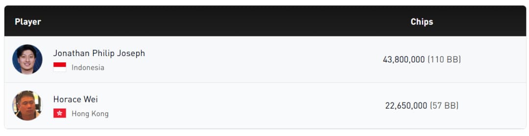 在经过了两个小时有来有往的较量之后,这场单挑终于来到了尾声。在最后一手牌里,印尼选手Jonathan Philip Joseph开池之后,拿着K♠Q♠的中国香港选手魏楠直接全下。Philip秒call,并秀出了一手A♣J♣。