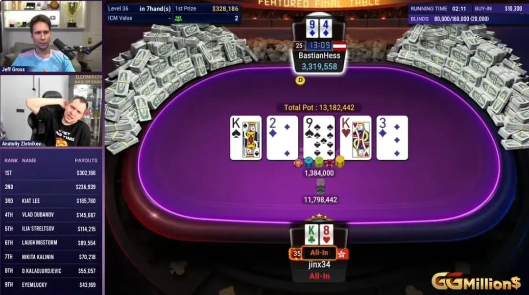 最终单挑由jinx34对阵奥地利的卫星赛选手BastianHess,前者拥有12:1的巨大优势。尽管BastianHess曾靠口袋9翻倍过一次,但气势转瞬即逝。仅5分钟后,关键终局手牌上演。
