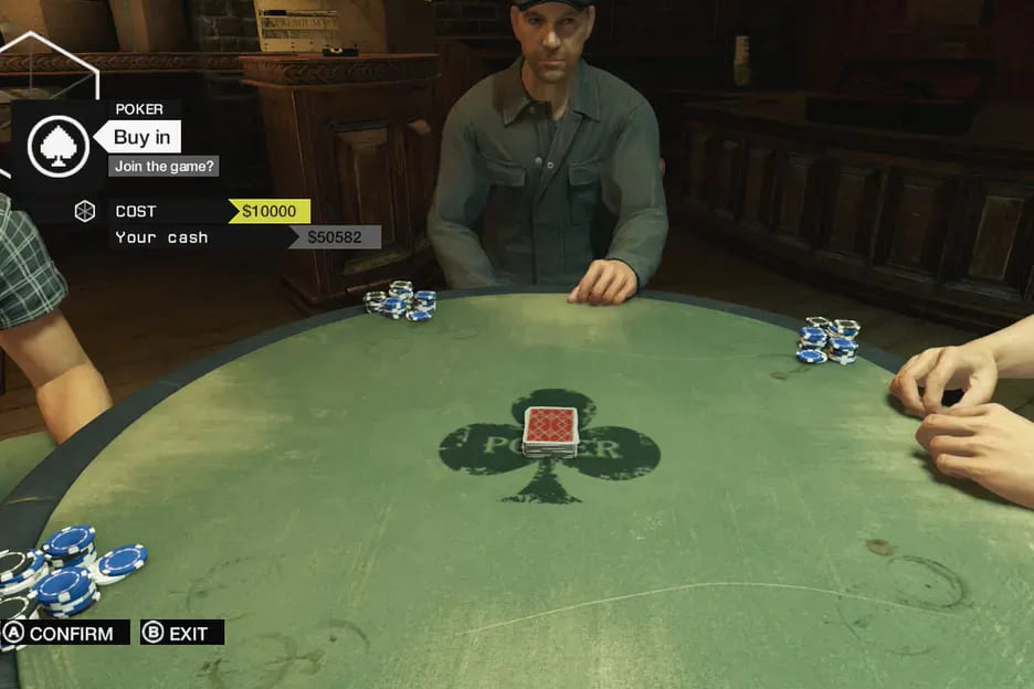 游戏玩法是德州扑克,你可以在不同场所参与不同级别的对局。有些牌局,尤其是高额桌,要求你必须穿着得体才能入座。扑克规则相对直接——采用标准德州扑克规则——如果你有兴趣,还有多人模式可选,让你在游戏世界中与其他玩家一较高下。