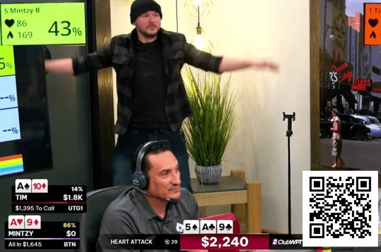 仅半小时后,Pool又面临全下抉择:当时牌面5♠A♣9♣,他手持A♠10♦。Mintz 全下1,645,Pool随即起身做开合跳,试图让心率升至全场最高。尽管成功提升心率,但他的牌力远逊于 Mintz 的顶两对。玩家再次同意分两次发牌,Pool仍未能逆转,再失重大底池。