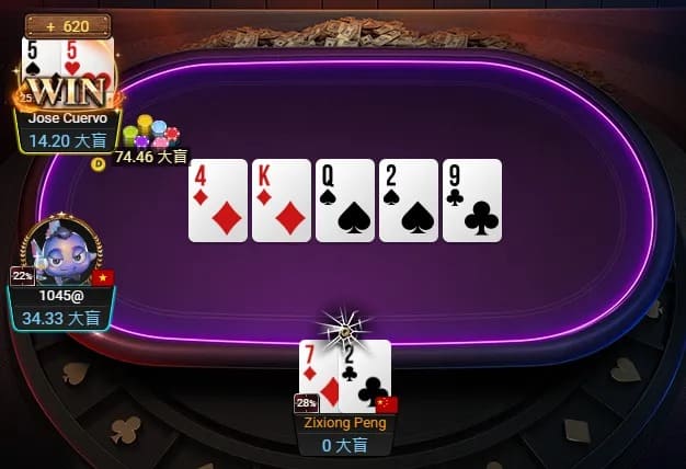 随后,他再度凭着AKs淘汰厄瓜多尔选手,除了开出3,300神秘赏金,还一举成为CL。来到三人阶段,Zixiong Peng的码量和越南选手相去不远,墨西哥选手多约15BB。