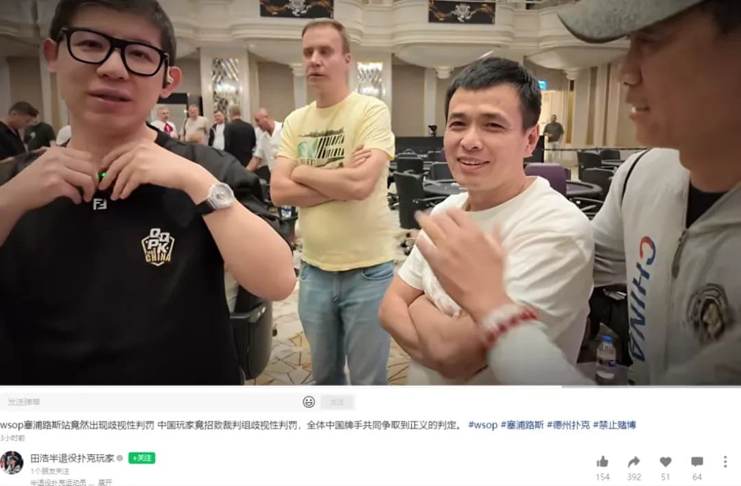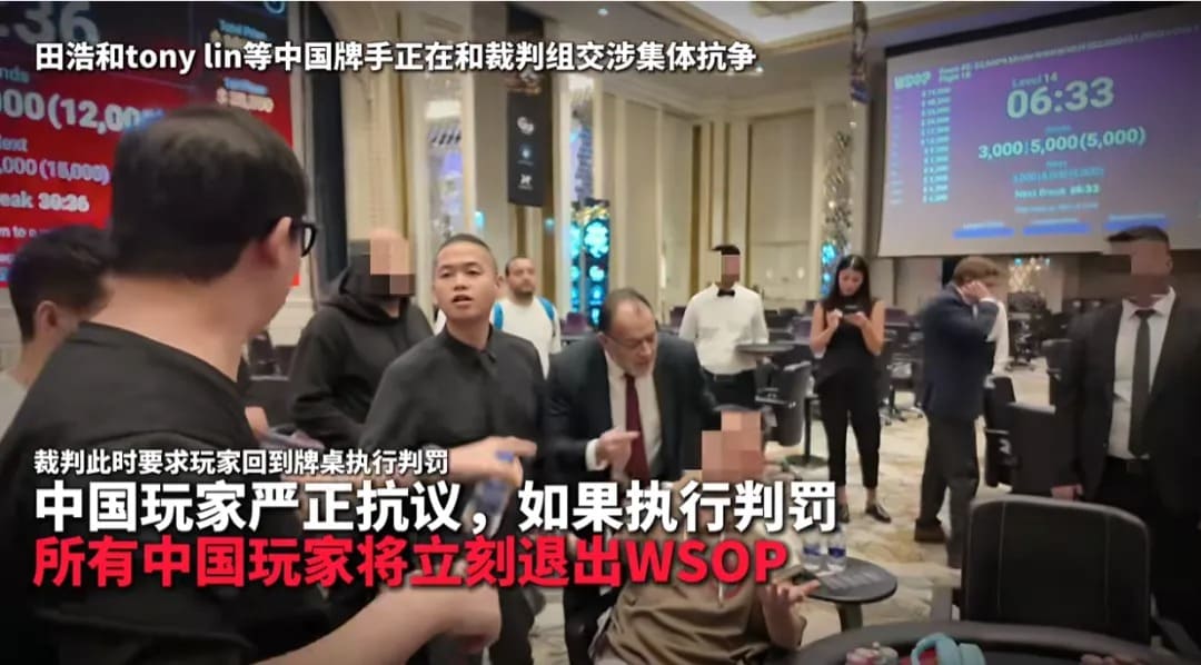 闻讯赶来的田浩、Tony Lin等中国牌手与裁判进行交涉,其他中国玩家也加入抗争。