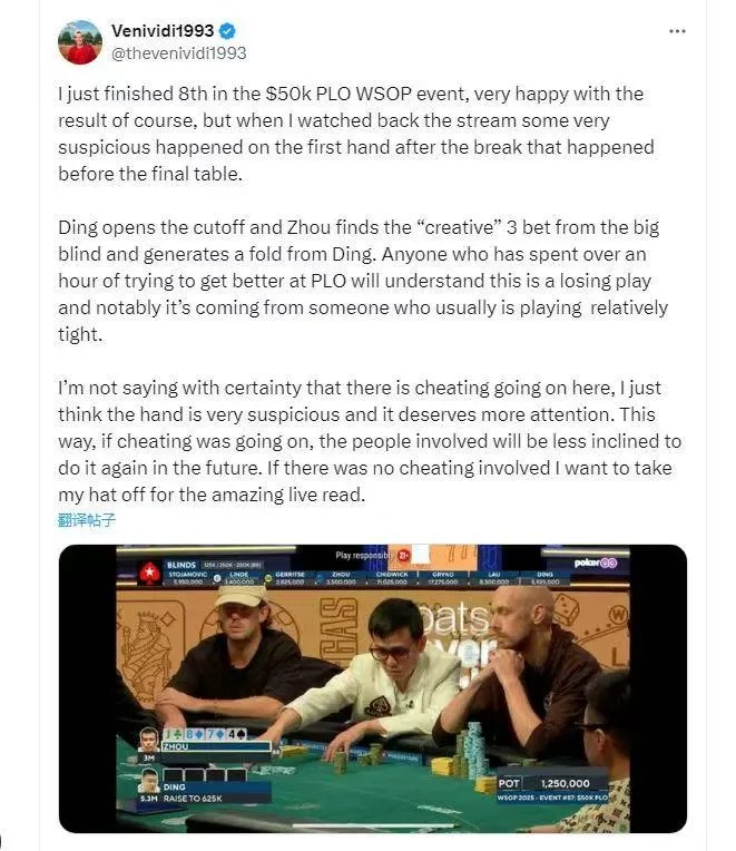 可外国选手却在牌局结束后站起来指控“两人伙牌”,并直接叫来裁判。