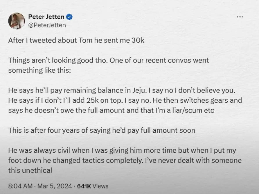 高额桌职业牌手Peter Jetton是第一个公开点燃这个话题的人。在二月中旬,他在X(前身为Twitter)上发出警告:"我建议不要与Tom Dwan进行财务往来。他欠我22.6万美元已达四年之久,并且持续使用拖延战术来逃避偿还债务。"