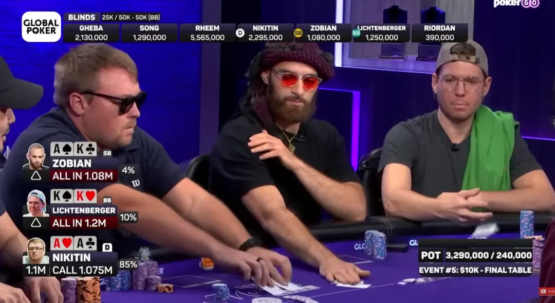 Nikitin重新确认了手牌后,也宣布全下。Zobian思考数秒后跟注。三人亮牌,一切摊开。