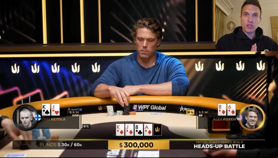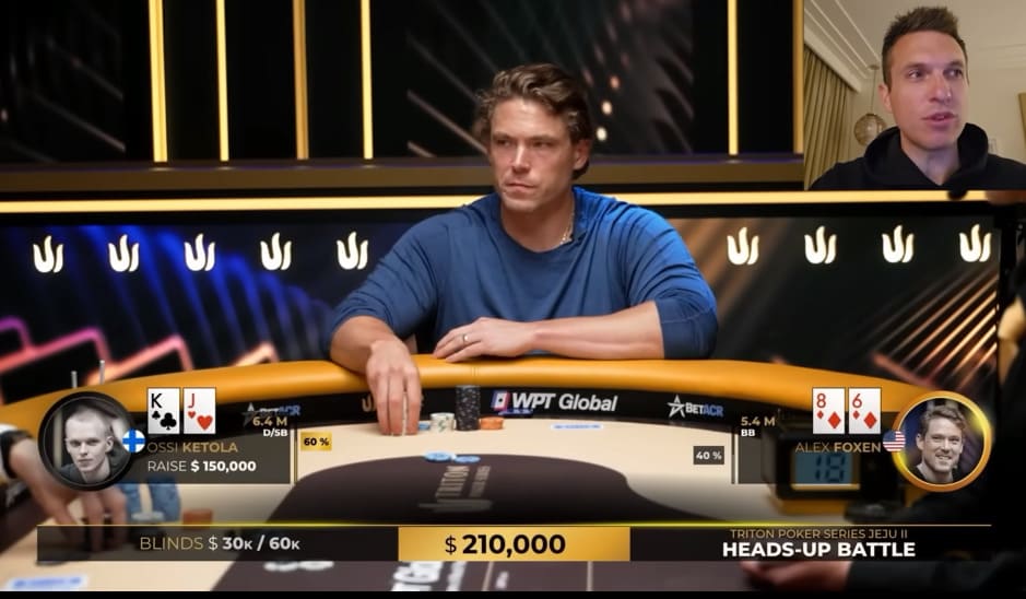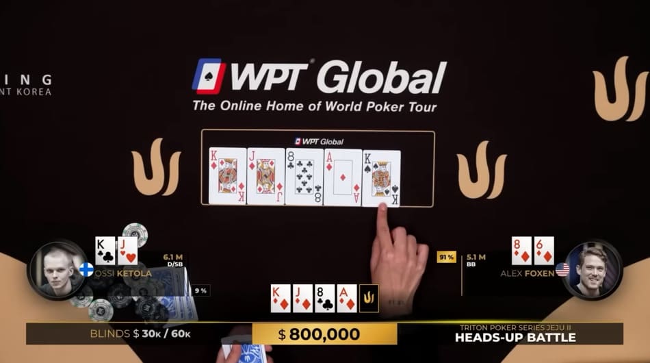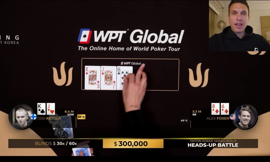 这手牌发生在传奇扑克超豪赛济州站,国王Monarch,也就是来自芬兰的豪客新秀Ossi Ketola,和高额桌职牌Alex Foxen展开德州扑克单挑桌,规则是赢家拿走全部奖金。