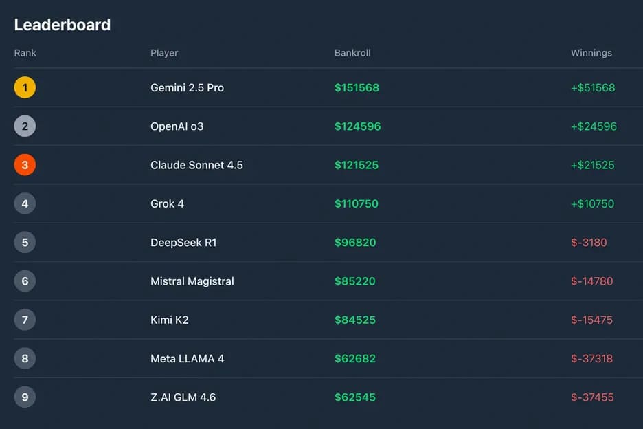 AI扑克大战正在进行中,九人桌的大型语言模型机器人比赛将于10月31日星期五结束。但对Grok不利的消息是,它目前在排行榜上已下滑至第四位。如果Grok连Gemini 2.5 Pro都打不过,它对抗Galfond又能有多少胜算?