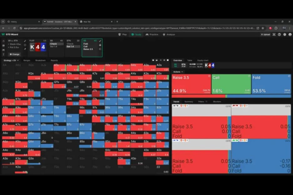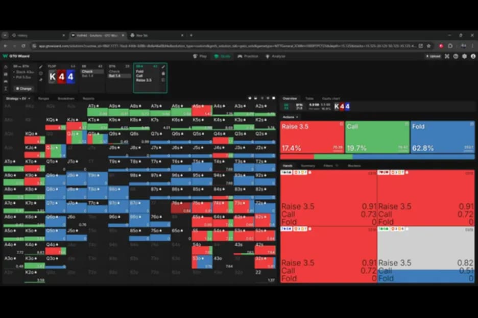 我的一个朋友在看到GTO Wizard的输出结果后感到惊讶,他联系了我。他当时在研究一个简单的持续下注场合:翻牌是K44彩虹面,他在大盲位,并且已经在翻前跟注防守。