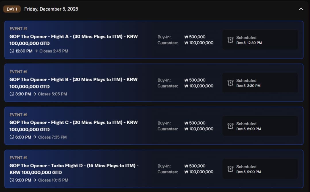 整个系列赛诸神扑克安排了五场中额(1百万韩币左右)两日赛,如下表所示。