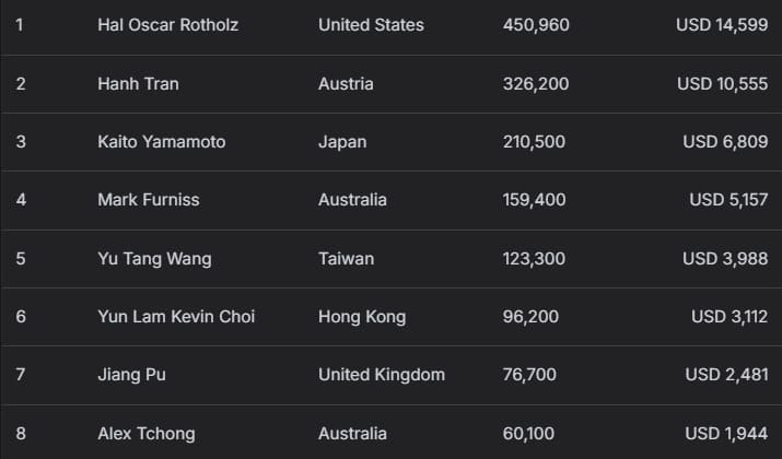 曾在APT济州站豪取五项混合赛制冠军的奥地利选手Hanh Tran,离自己生涯第七座APT奖杯仅一步之遥,最终收获亚军及326,200新台币(10,555美元)奖金。日本选手Kaito Yamamoto获得季军,奖金为210,500新台币(6,809美元)。