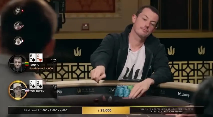 “我们拿着 72 的时候来个悬赏吧,” Tom Dwan提议,想给游戏加点料。