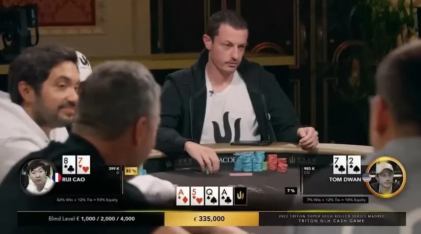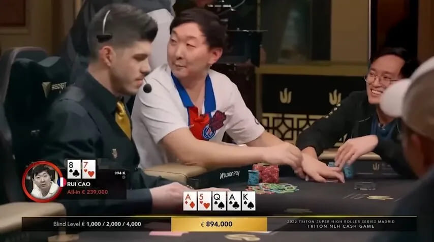 这手牌发生在马德里的Triton系列赛,盲注为1,000/2,000,并有强制性的4,000straddle(曹睿)。