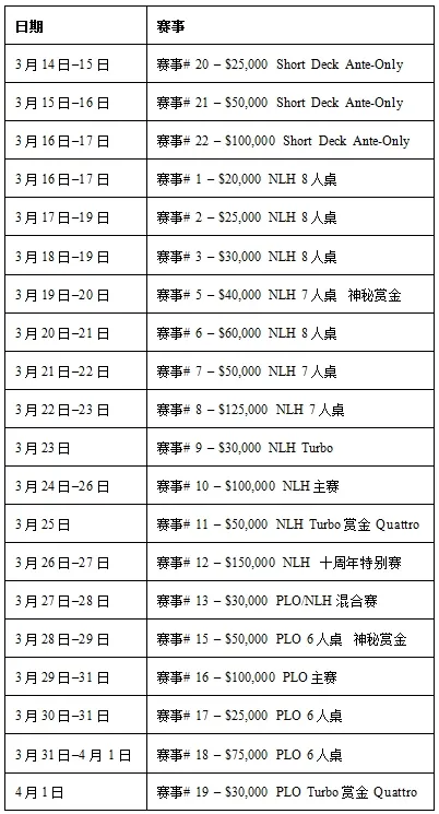 系列赛将于3月14日至17日率先展开,期间安排三项Short Deck赛事,买入分别为$25,000、$50,000与$100,000,为整个赛程拉开序幕。