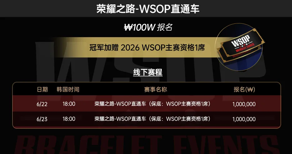 报名100万韩元 (约680刀),冠军将获得价值1万刀的2026年拉斯维加斯WSOP主赛门票一张!