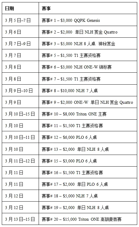 本届焦点赛事为买入$8,000的Triton ONE主赛。主赛设有三个起始轮次,赛期为3月10日至15日。与此同时,赛程中还安排了三场买入$1,500的主赛资格赛,使玩家有机会以远低于主赛买入的成本,冲击预计达到七位数的冠军奖金。
