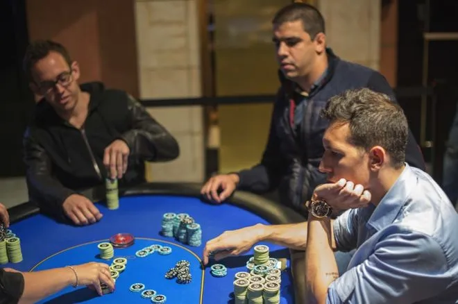 背景:维加斯现场,盲注10-20。你在大盲位,松凶形象,码量6200。玩家C紧凶但混合欺骗性打法,码量3400。